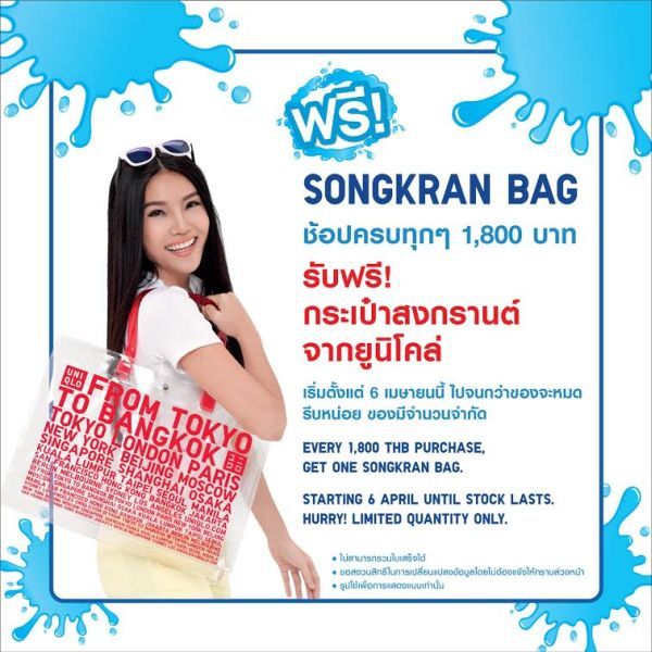 เตรียมช้อปให้จุใจไปกับสินค้าหลากหลายรับซัมเมอร์จากยูนิโคล่ พร้อมรับกระเป๋าสงกรานต์แบบไม่ต้องลุ้นได้ก่อนใคร ตั้งแต่วันที่ 6 เมษายน 2559 เป็นต้นไป หรือจนกว่าสินค้าจะหมด ที่ร้านยูนิโคล่ทุกสาขาทั่วประเทศ